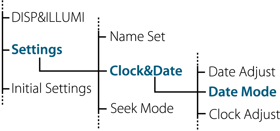 2. Seleccione "Settings" > "Clock&Date" > "Date Mode" com o botão [Control].