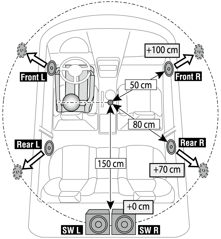 Точная настройка значения компенсации положения динамиков приведена в <5-3. Выбор типа автомобиля.