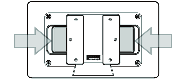 - Montáž zahajte vysunutím obou jezdců na zadní straně displeje do stran a poté zarovnejte držák na hlavní jednotce s drážkou v displeji.