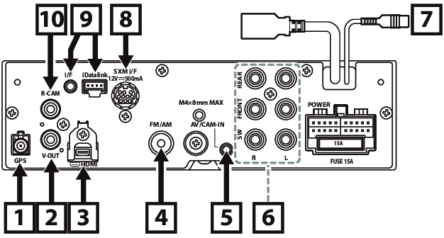 ⑧ | Conector del sintonizador para vehículos SiriusXM Connect Para obtener más información acerca de cómo instalar el sintonizador SiriusXM Connect Vehicle, consulte la guía de instalación suministrada con el sintonizador. |