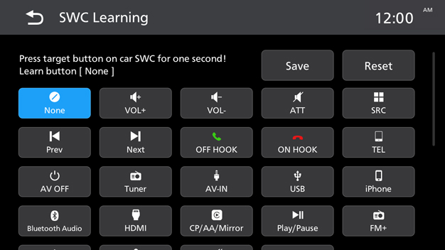 Touch a function button on the screen, then press target button on car SWC for more than 1 second.